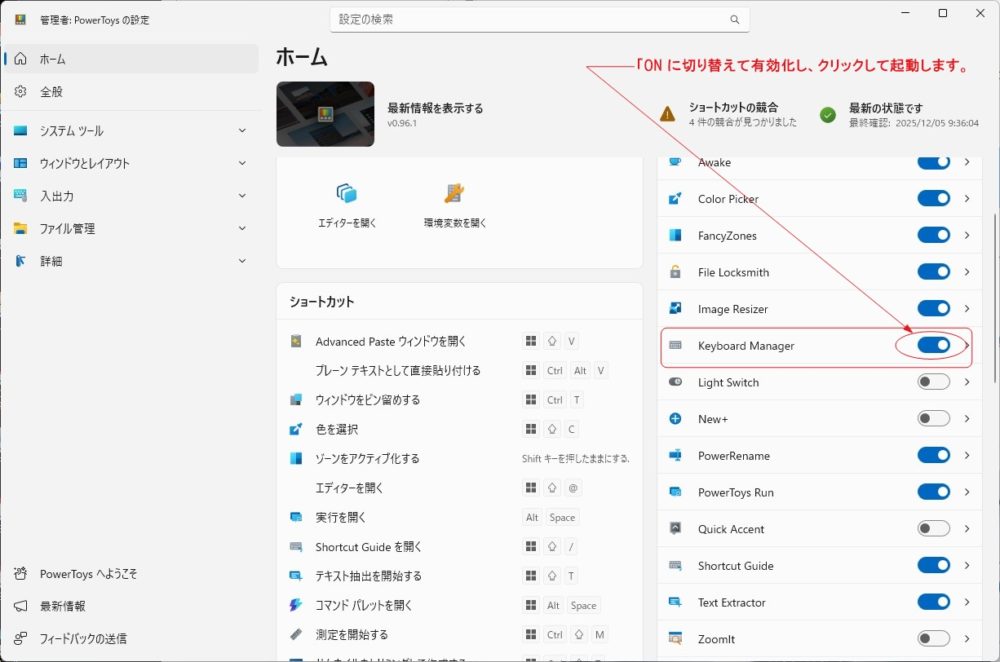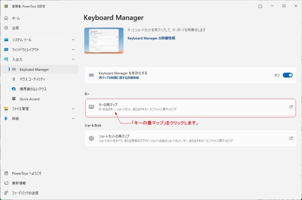 - 「Keyboard Manager」が無効になっていたら有効にする
