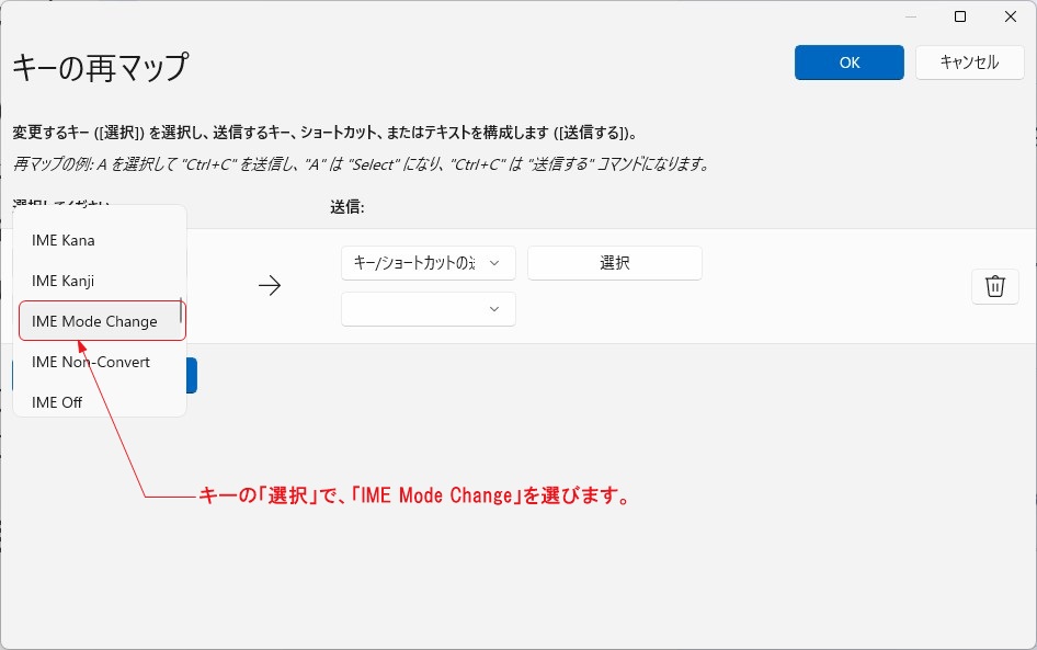 - 選択欄で、「IME Mode Change(変換キー)」を選択