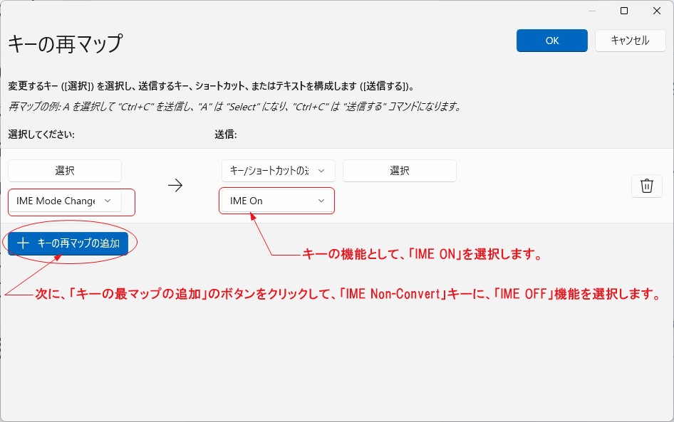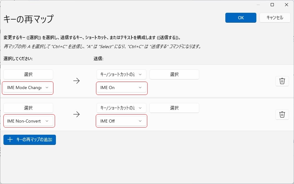 「+ キーの再マップの追加」ボタンをクリックして、キーの再マップの追加します。