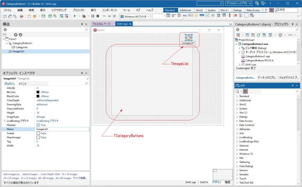 TCategoryButtonsとTImageListコンポーネントをフォームにDropします。