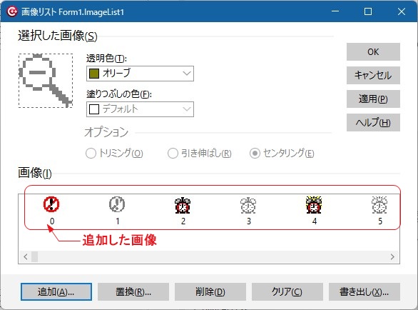 TImageListへ画像を追加します。ImageList1をダブルクリックし、「追加」ボタンから画像を追加します。