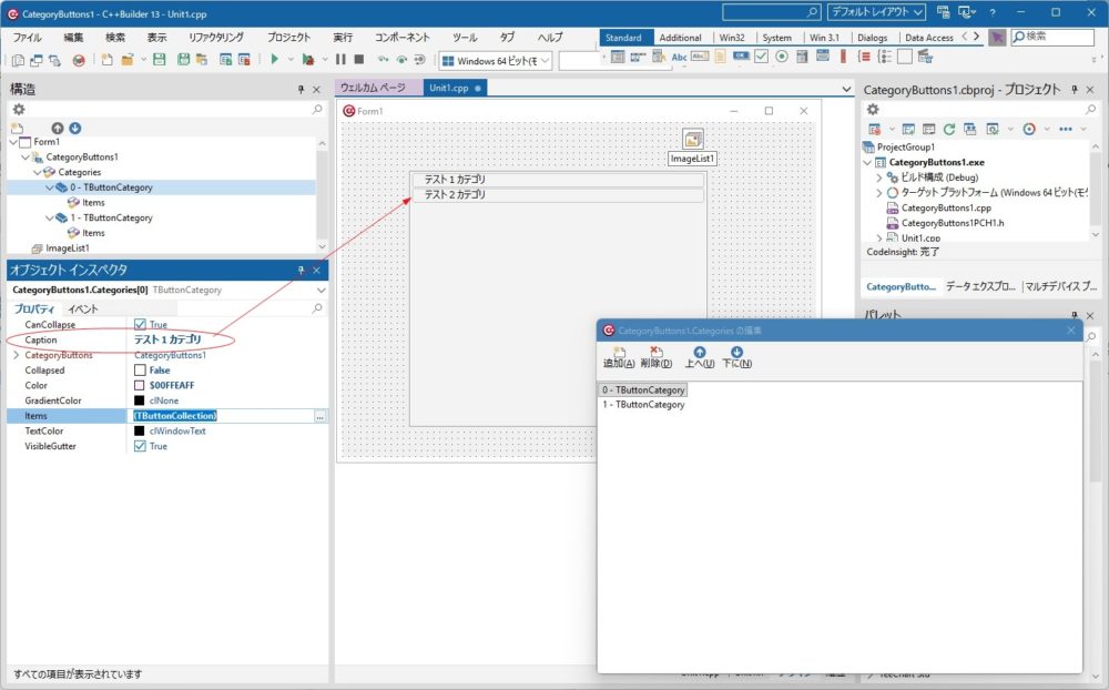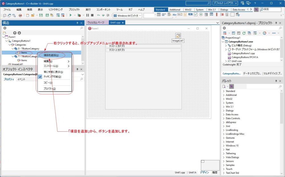 「TButtonCategories」のItemsピロパティの「…」か、Itemsを右クリックして表示されるポップアップメニューの「項目の追加」ボタンをクリックしてボタンを追加します。