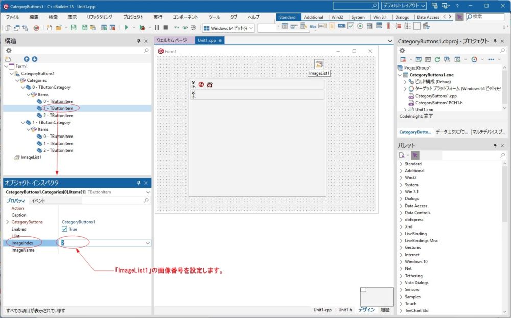 各ボタンにアイコンを設定してみましょう。先程、画像を追加した「ImageList1」を、「CategoryButtons1」の「Images」プロパティに設定します。