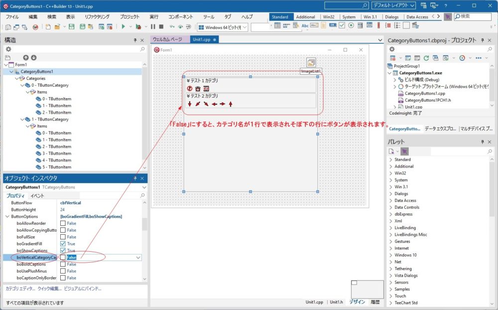 CategoryButtons1のButtonOptions内の「boVettialCategoryCaptions」プロパティを「False」に設定するとカテゴリ名が1行で表示され、その下にボタンが表示されるようになります。