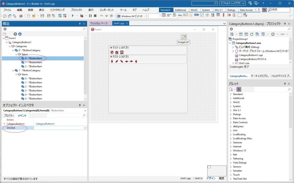 CategoryButtons1コンポーネントの「OnButtonClicked」は、ボタンがクリックされた時に発生します。どのボタンが押されたかは引数の ButtonItem で判別します。