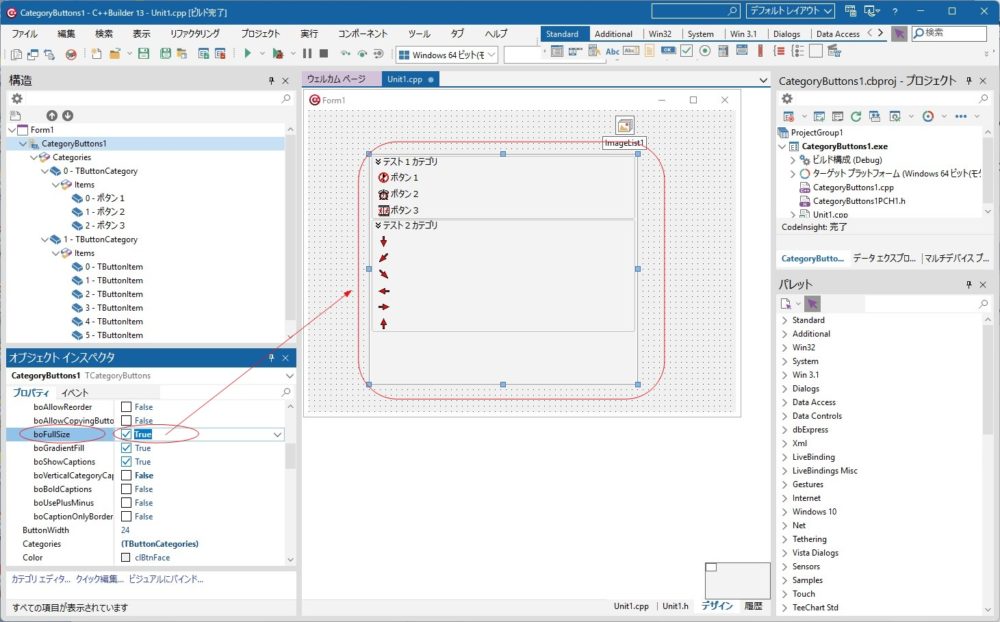 CategoryButtons1のButtonOptions内の「boFullSize」 を 「True」 にするとボタンがカテゴリの横幅いっぱいに広がり、最近のアプリらしいサイドバーメニューのような外観になります。